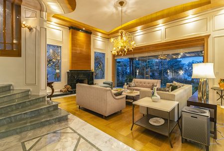 El gran salón principal destaca por su refinado diseño, con una impresionante lámpara de cristal soplado de Murano como pieza central y una chimenea sofisticada, que aportan calidez y distinción al espacio.
