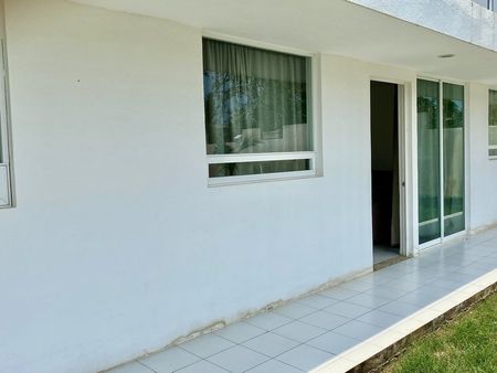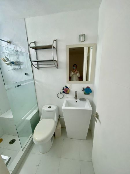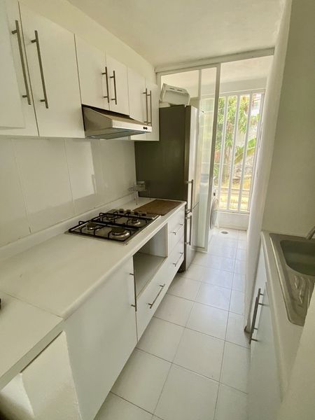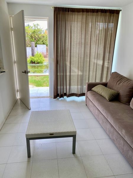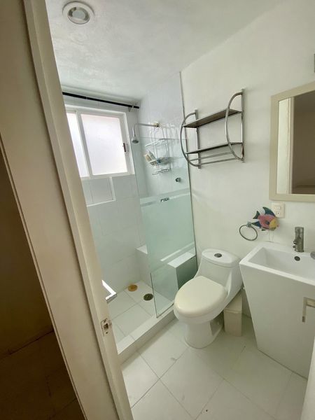Departamento de 57.60m2 con aire acondicionado, estancia de sala/comedor, cocina integral con área de lavado, dos recamaras la principal con baño y vestidor, la recamara secundaria comparte baño con visitas, un lugar de estacionamiento, alberca, jardines, vigilancia 24/7