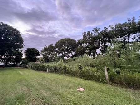 Este terreno es ideal para construir una privadita de casas tipo townhouse. Esta rodeado de árbolas de caoba y da de calle a calle al frente y atrás. Tiene una excelente ubicación y no se diga la plusvalía. La casita que está construida tiene una pequeña estancia, cocineta y baño completo. Además cuenta con sistema de riego y las bardas tienen una altura de 3 metros de altura.