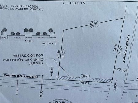 Excelente terreno en esquina con dos frentes: uno de 78.20 metros al sur y otro de 100 metros al oriente, además de 92.70 metros al norte y 74.80 metros al poniente.
