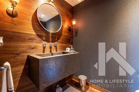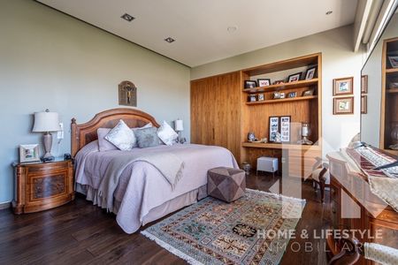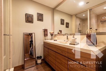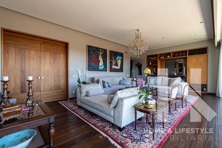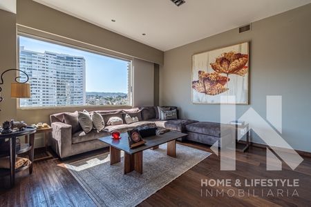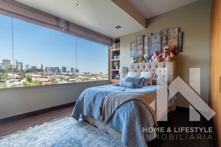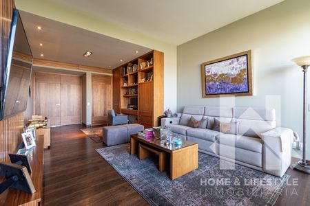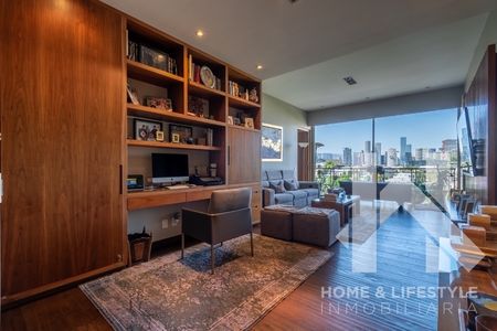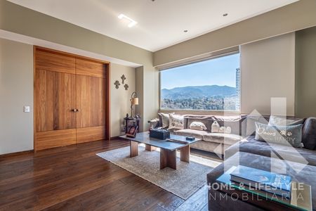 Trescientos cincuenta metros cuadrados con preciosas vistas verdes a la montaña, a la ciudad y a las copas de los árboles. El departamento tiene excelente iluminación debido a sus grandes ventanales y techos altos, cuenta con doble terraza, tiene pisos de madera, acabados de lujo y excelentes trabajos de carpintería adicional en clósets y un clóset/librero en la recámara principal. El departamento cuenta con elevador al piso, elegante vestíbulo y con amplios espacios en sala y comedor con salida a una de las terrazas. Tiene gran Family/sala de TV y baño de visitas. Cuenta con 3 amplias recámaras, aunque una de las secundarias, tras la remodelación, se convirtió en un cómodo estudio pero con la posibilidad de ser utilizada de nuevo como recámara. Cada una de ellas cuenta con baño completo y walking clóset con excelentes acabados. Tiene cocina integral con cubierta de granito, muy equipada y con preciosa vista.