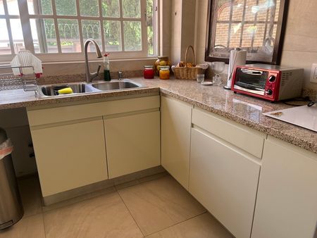 Cocina amplia con gabinetes en color crema para guardar todo lo que necesite.