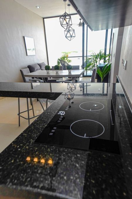Cocina con Gaveteros inferiores con meseta de granito y parrilla.
