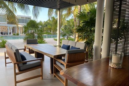 PLANTA BAJA: Sala doble altura, comedor, baño de visitas, cocina equipada con barra de granito y amplios despenseros, cuarto de servicio con baño completo, cuarto de lavado, pasillo lateral de servicio con entrada independiente, jardín posterior, cochera techada para 2 autos.